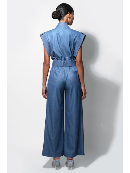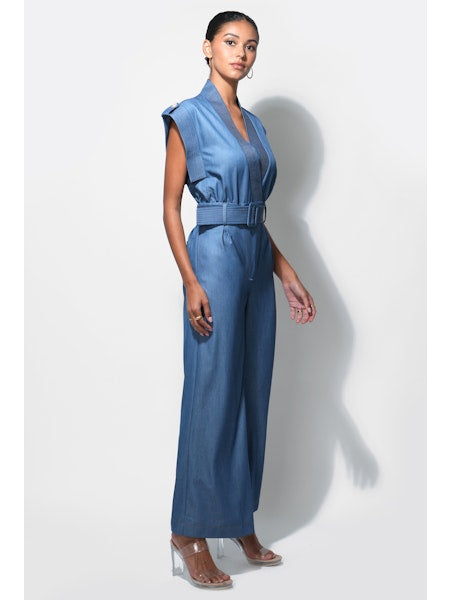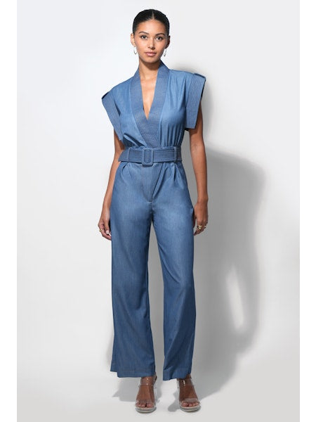 Una pieza poderosa que combina estructura, elegancia y comodidad. Este jumpsuit redefine el denim con un diseño sofisticado: escote en V profundo, hombros estructurados y pierna ancha que estiliza la silueta. Su cinturón integrado marca la cintura y eleva el look, logrando un balance perfecto entre fuerza y feminidad.