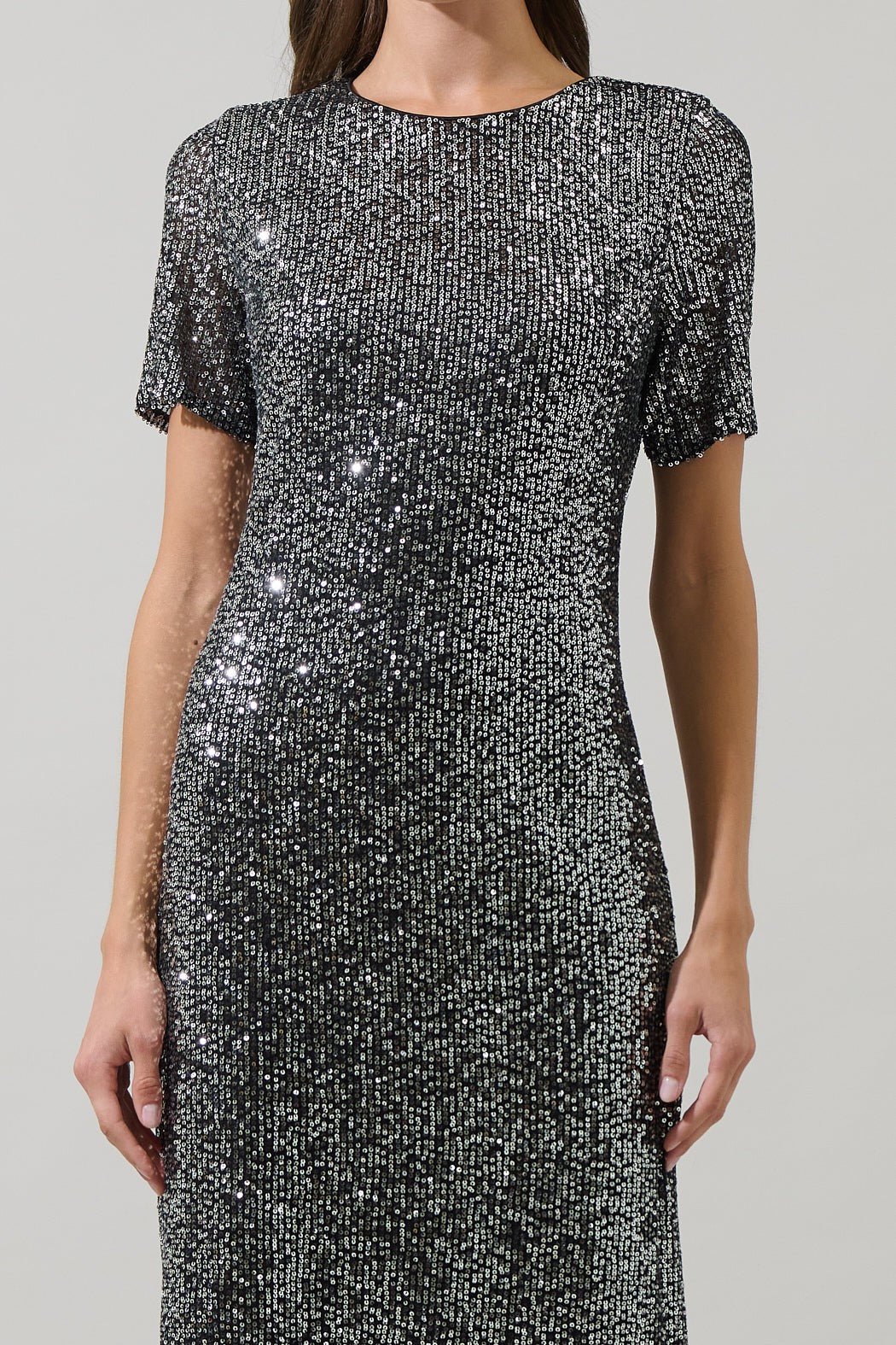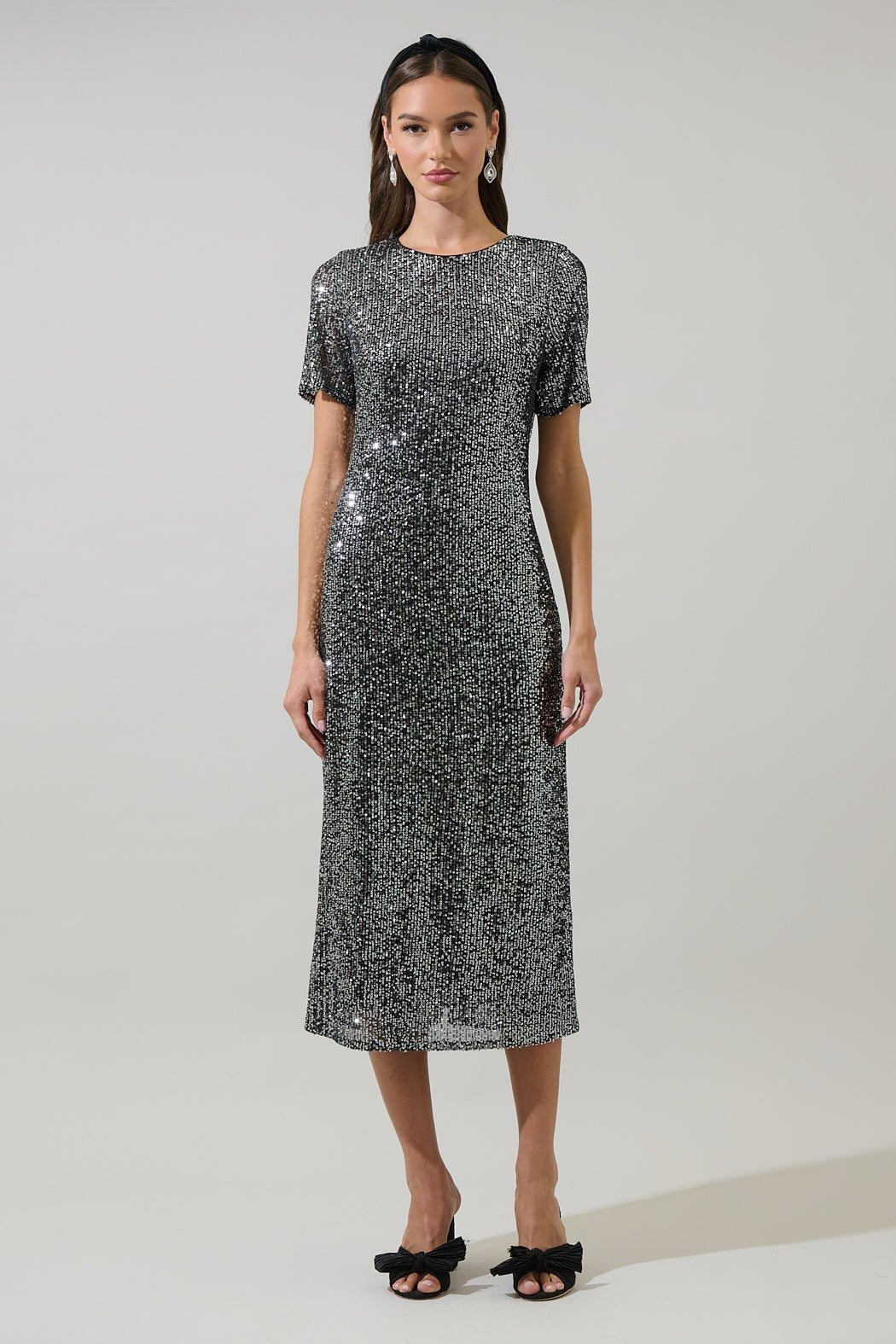 Este vestido midi de lentejuelas plateadas está diseñado para robar miradas. Su corte clásico y sofisticado resalta la figura, mientras que el brillo de las lentejuelas crea un efecto glamuroso y moderno — ¡perfecto para tus eventos más especiales!