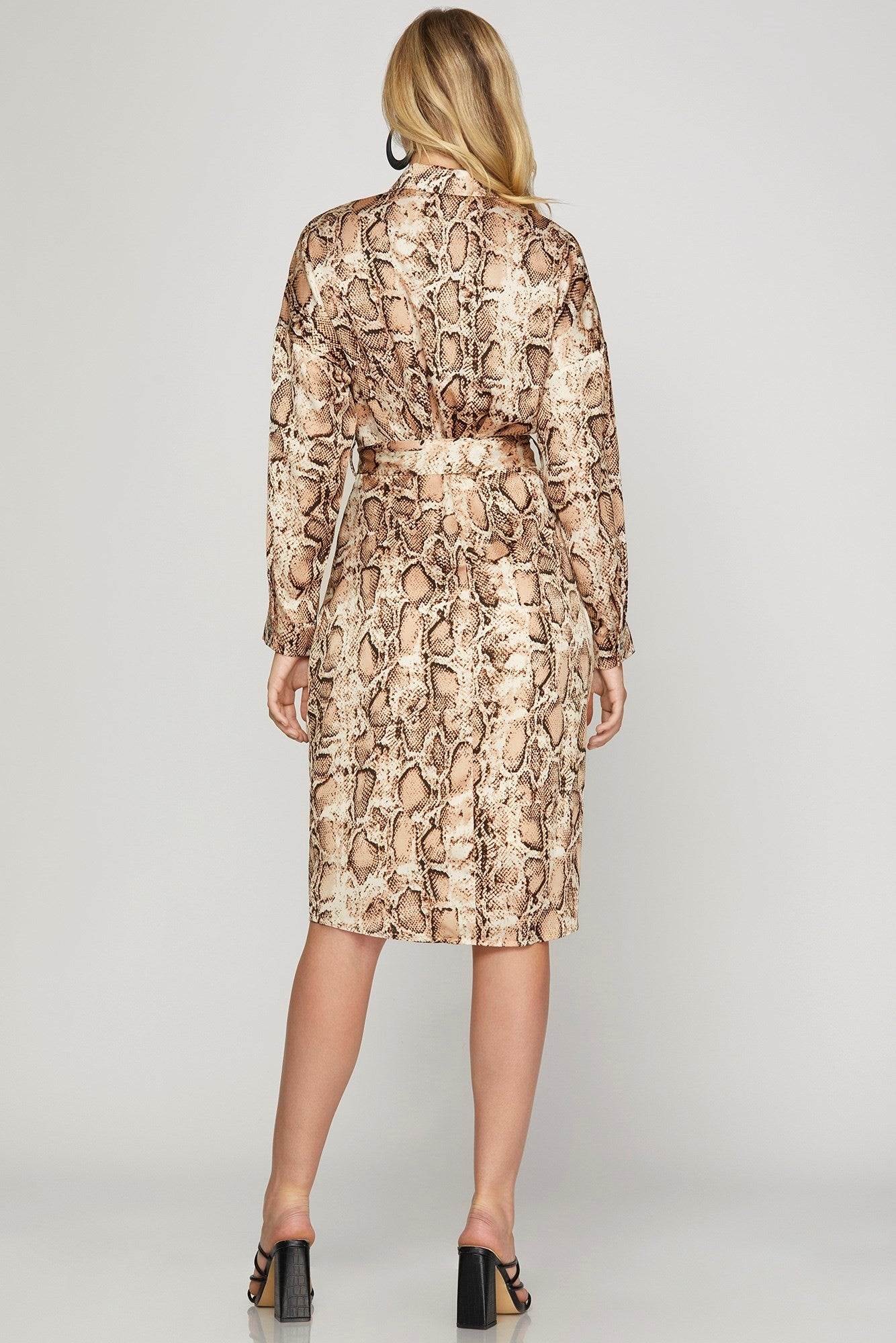 Este vestido camisa con estampado de serpiente es la definición perfecta de estilo con actitud. Su corte clásico con cinturón ajustable resalta la cintura, mientras que el estampado animal print aporta un toque audaz y sofisticado. Ideal para destacar tanto en la oficina como en una salida nocturna.