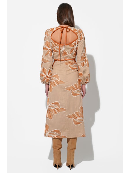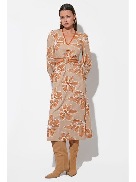 Eleva tu estilo con nuestro elegante Joy Maxi Dress, una pieza única que combina sofisticación y frescura. Confeccionado en una tela ligera y con un diseño floral en tonos cálidos, este vestido es perfecto para cualquier ocasión. El detalle de cinturón con hebilla central realza la silueta, mientras que las mangas abullonadas y el escote en V añaden un toque moderno y femenino