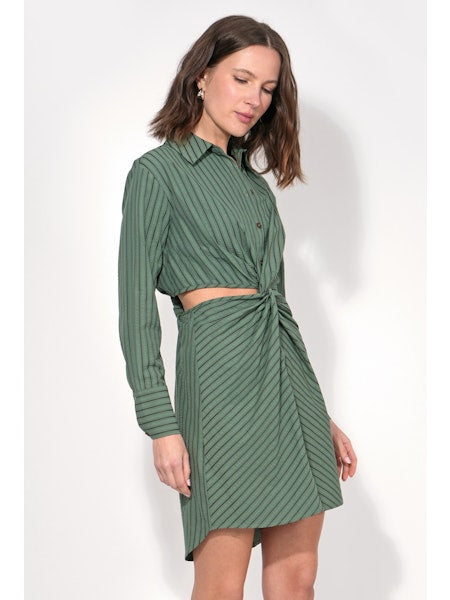 Este shirt dress con nudo frontal y sutil abertura en la cintura reinventa lo clásico con un giro moderno. El estampado de rayas estiliza la silueta y el diseño versátil lo convierte en el aliado perfecto para el día con sandalias planas o para la noche con tacones.