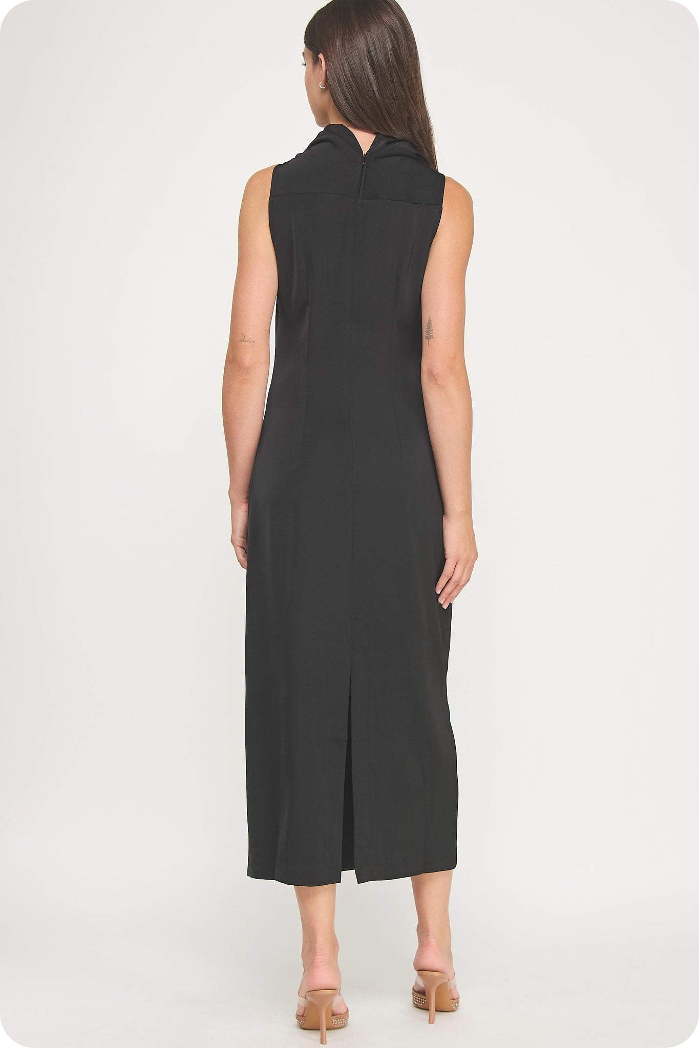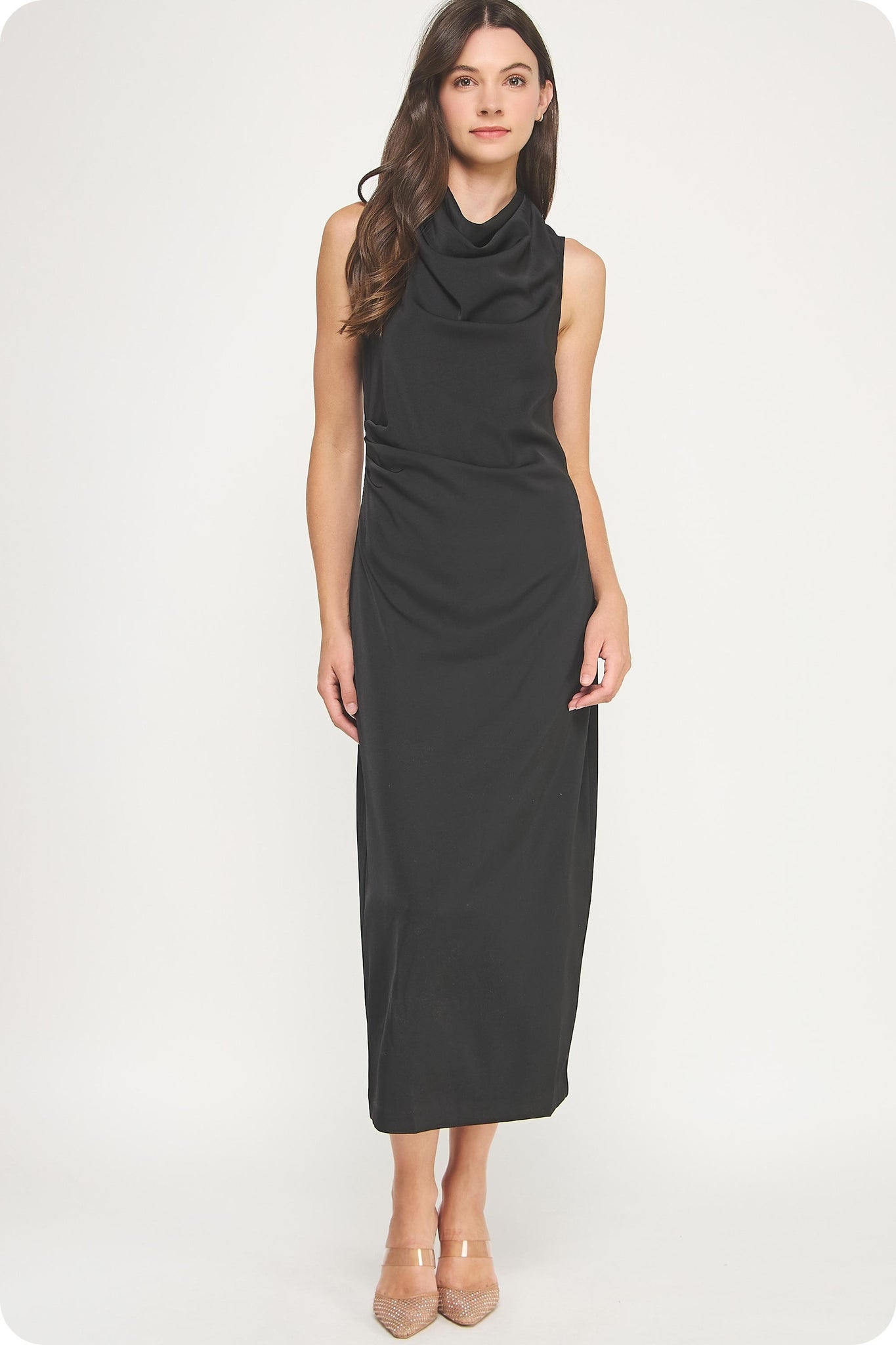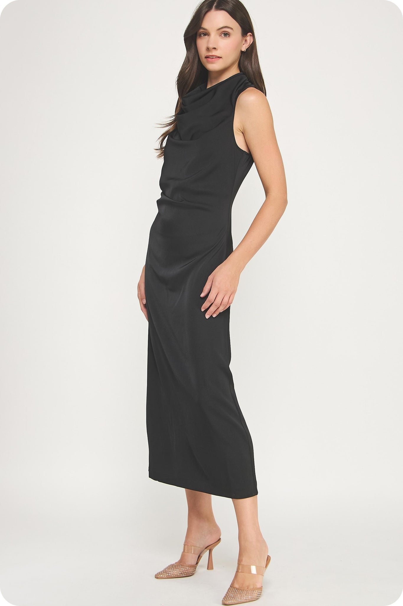 Este vestido negro satinado redefine la elegancia minimalista. Su corte midi y cuello drapeado realzan la silueta con un toque de sofisticación moderna. Perfecto para una cena especial, un evento formal o una noche elegante. 🌙